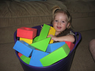 First we have the purple tote on clearance from JoAnn's for $3.50 filled with $8 worth of foam blocks from our local consignment store - Once Upon A Child.